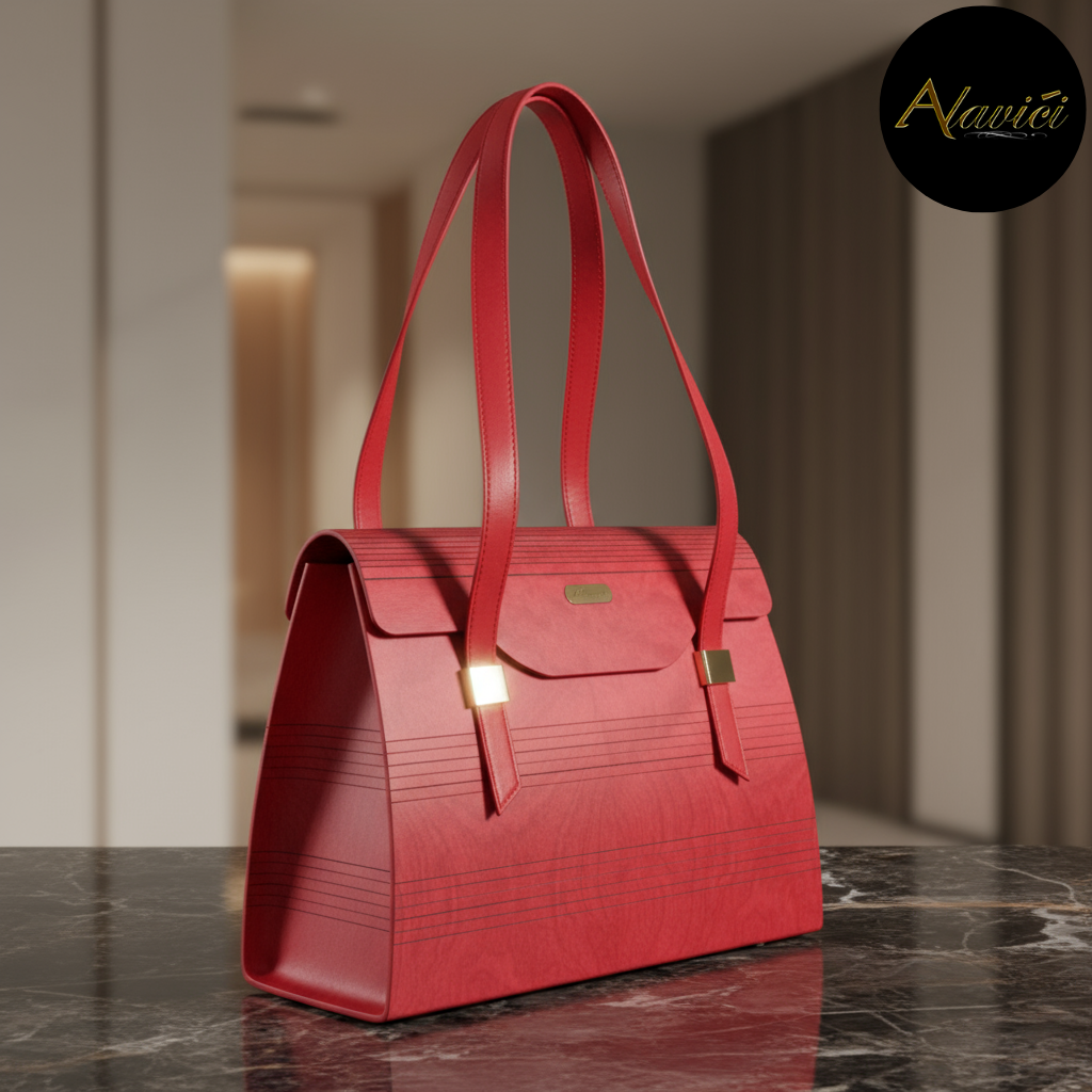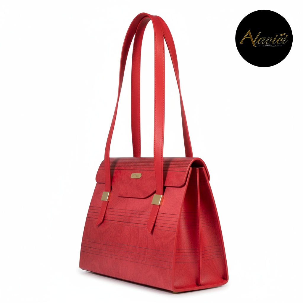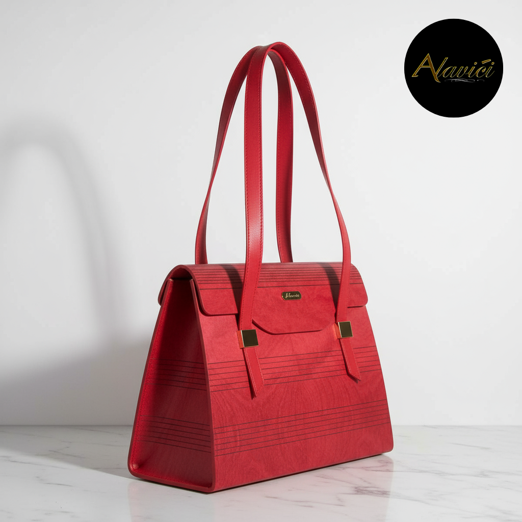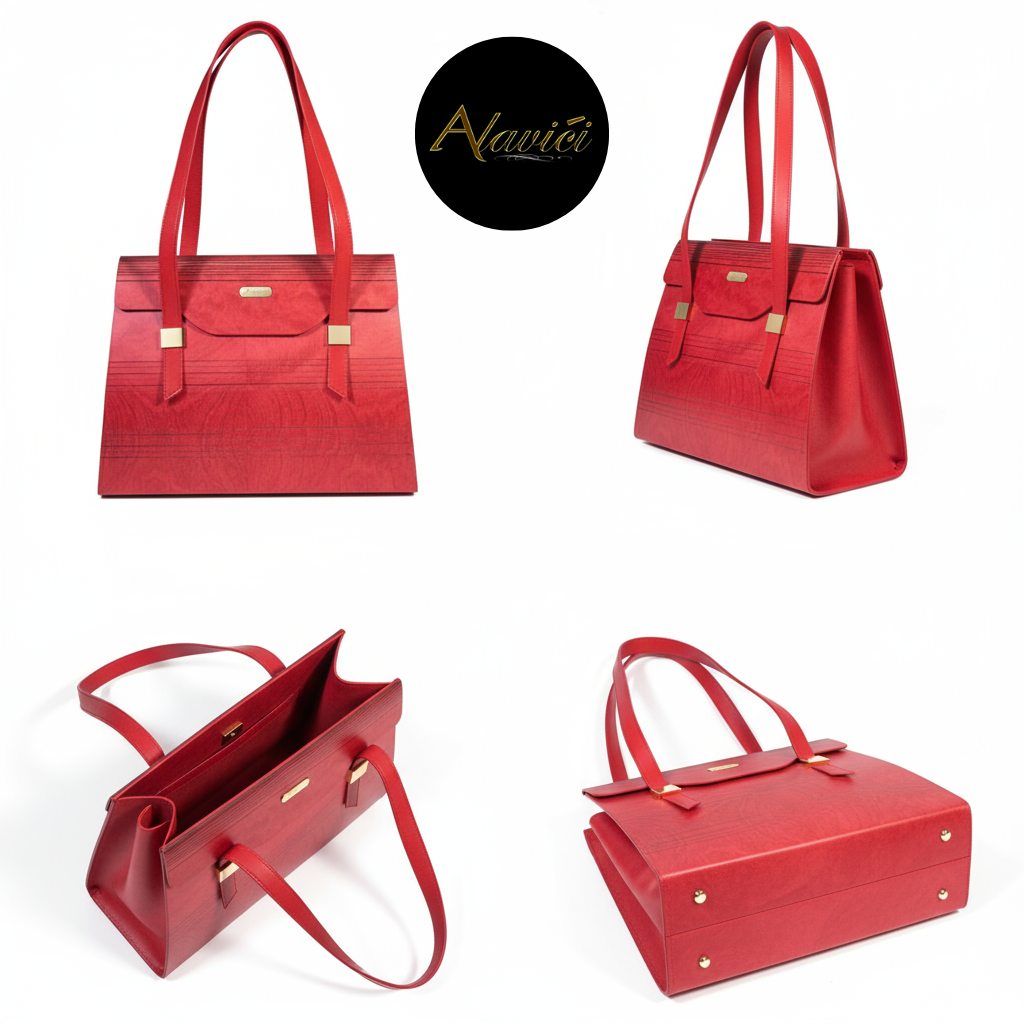 Meet the Alavici ZS-B010A — a sculptural trapeze tote crafted from richly dyed red wood veneer, polished to a jewel-like finish. The bold crimson hue paired with sleek black vegan-leather handles transforms a classic silhouette into a modern icon of power and elegance. Whether at a high-profile boardroom meeting or a private soirée, this statement bag radiates confidence.