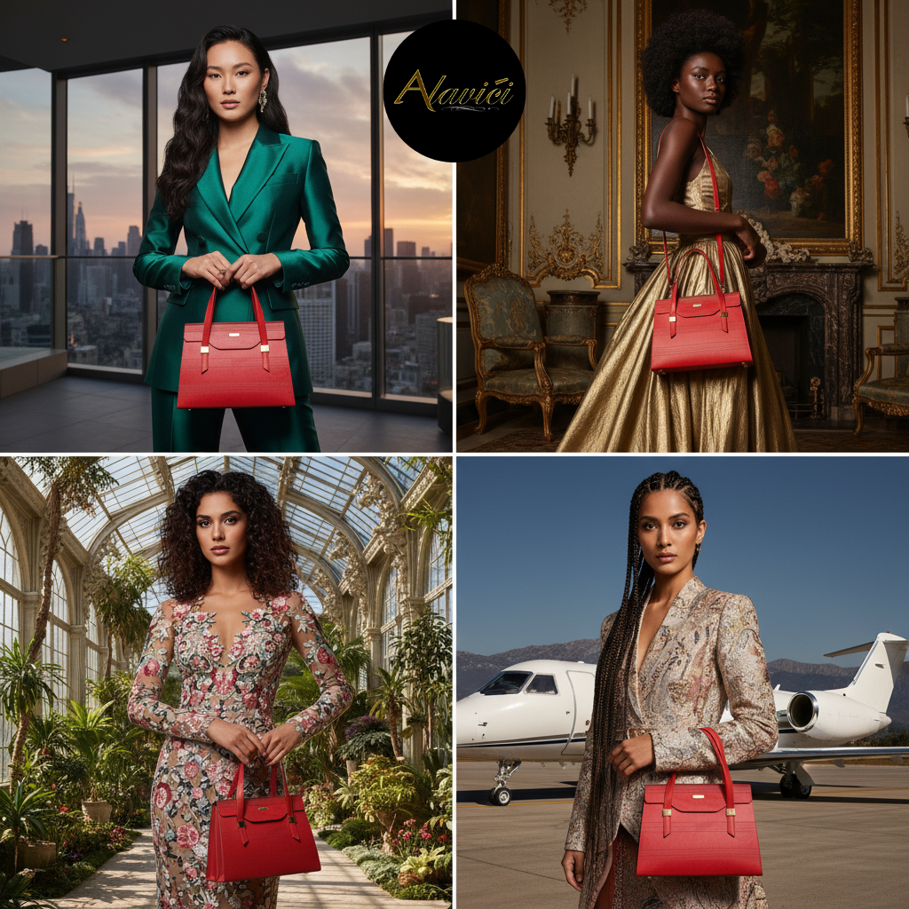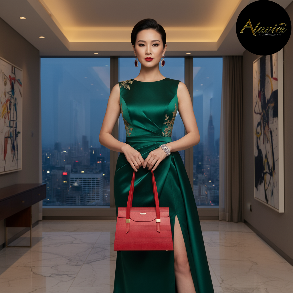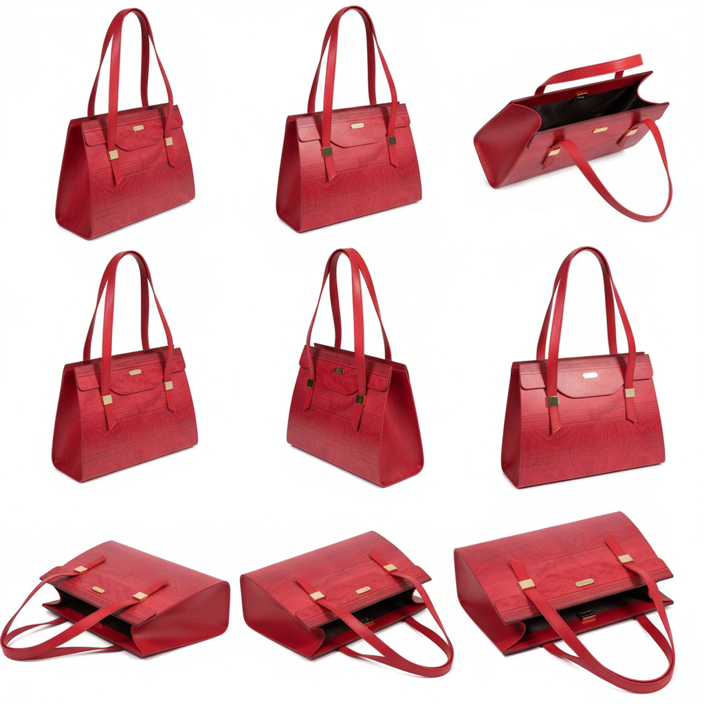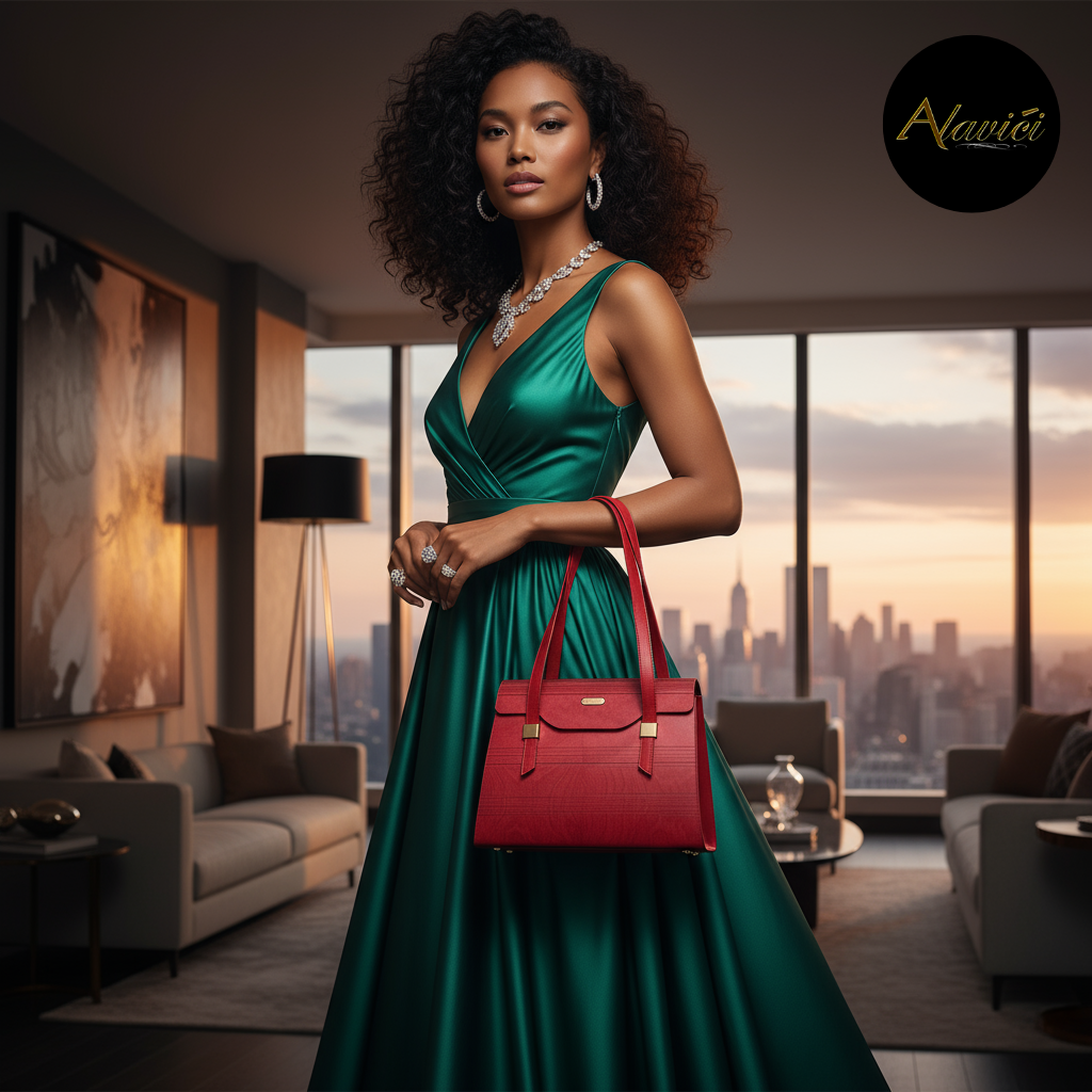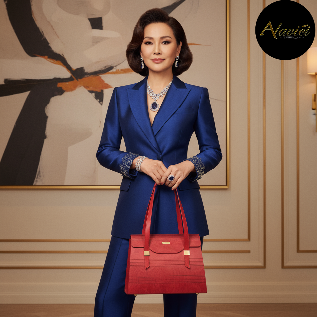 Meet the Alavici ZS-B010A — a sculptural trapeze tote crafted from richly dyed red wood veneer, polished to a jewel-like finish. The bold crimson hue paired with sleek black vegan-leather handles transforms a classic silhouette into a modern icon of power and elegance. Whether at a high-profile boardroom meeting or a private soirée, this statement bag radiates confidence.