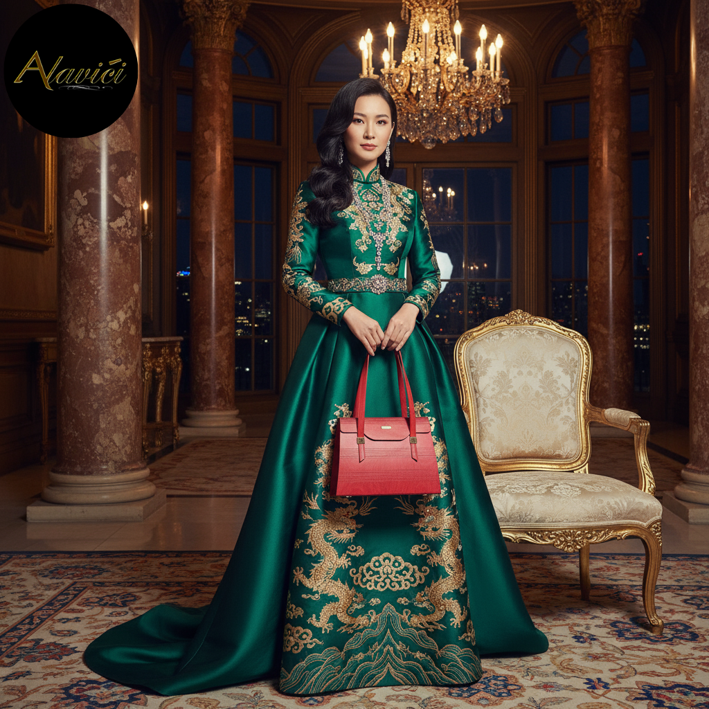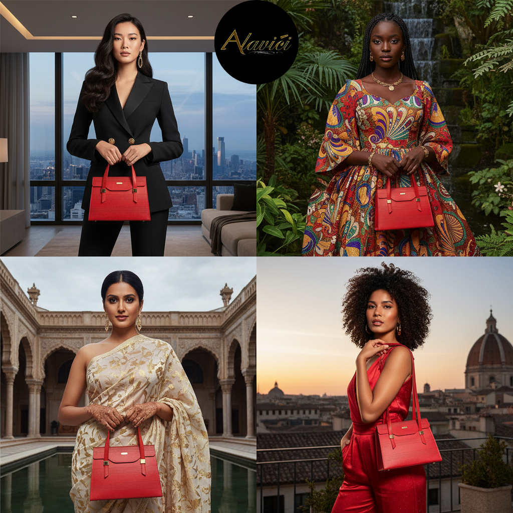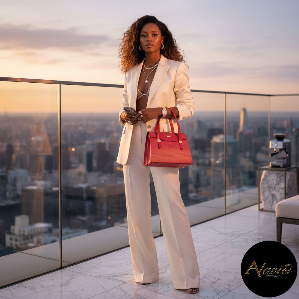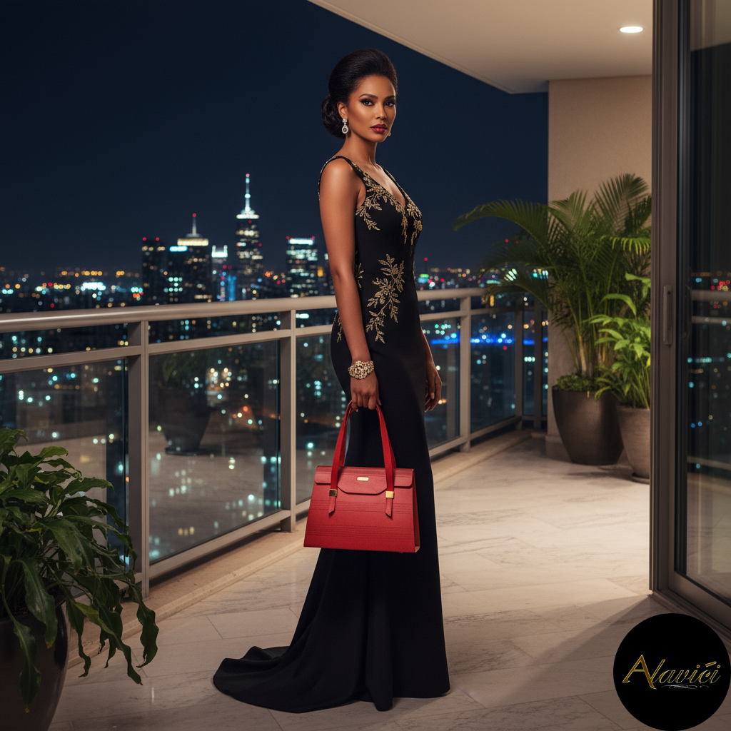 Meet the Alavici ZS-B010A — a sculptural trapeze tote crafted from richly dyed red wood veneer, polished to a jewel-like finish. The bold crimson hue paired with sleek black vegan-leather handles transforms a classic silhouette into a modern icon of power and elegance. Whether at a high-profile boardroom meeting or a private soirée, this statement bag radiates confidence.