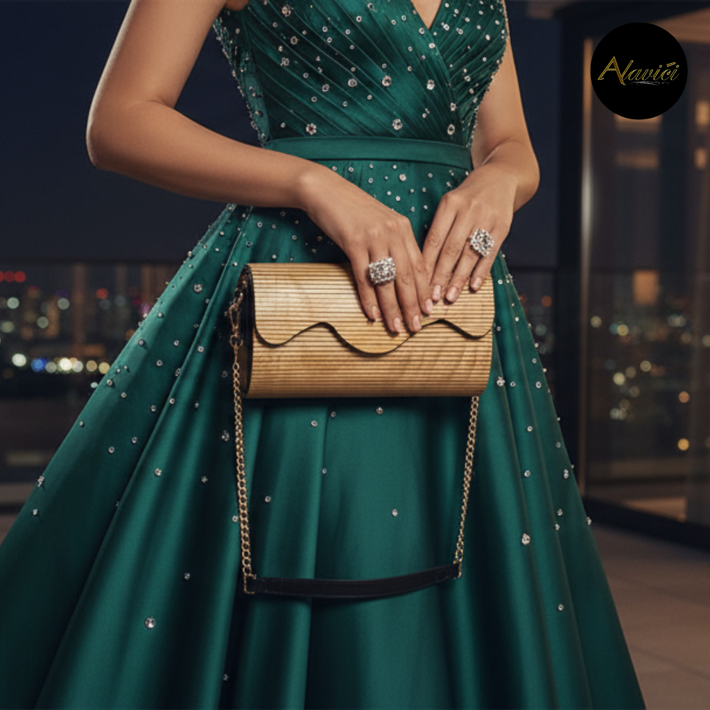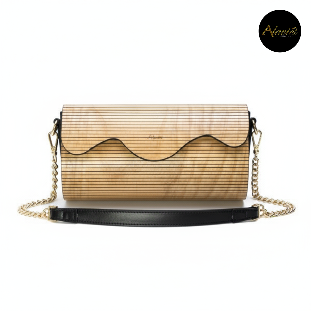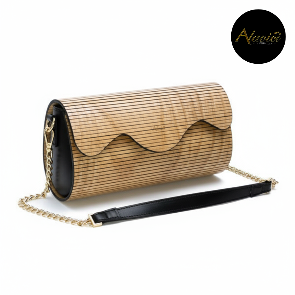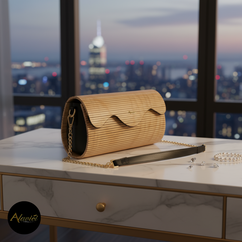 Introducing the Alavici ZS-WB008B “Tiffany” — an exquisite, slim zip-wrap clutch handcrafted from dyed wood with an opulent Tiffany-teal finish. Inside, buttery vegan leather cushions your essentials; outside, the wood’s fine grain and gold hardware make a quiet, unmistakable statement. Designed for the discerning client who prizes rarity, tactility and refined understatement.