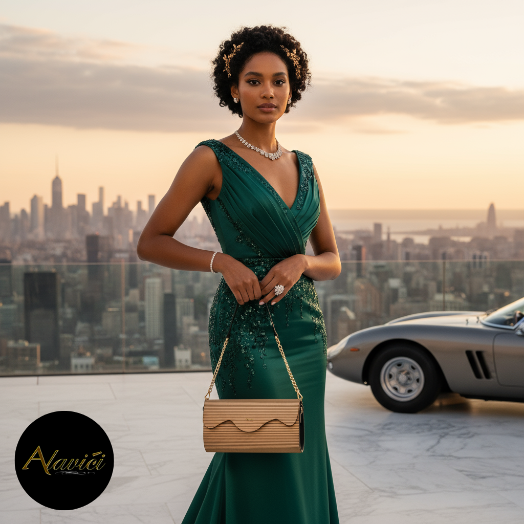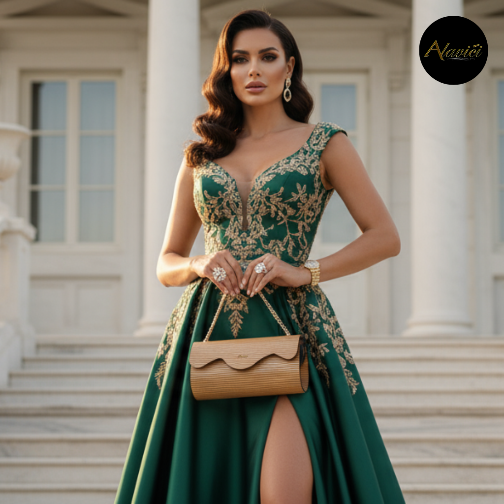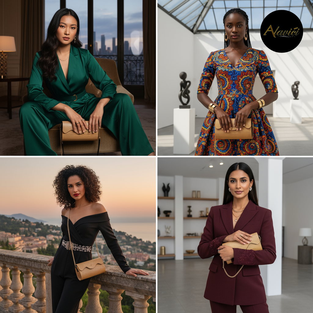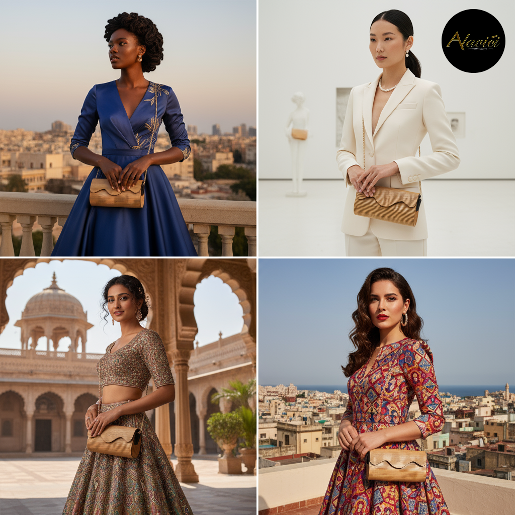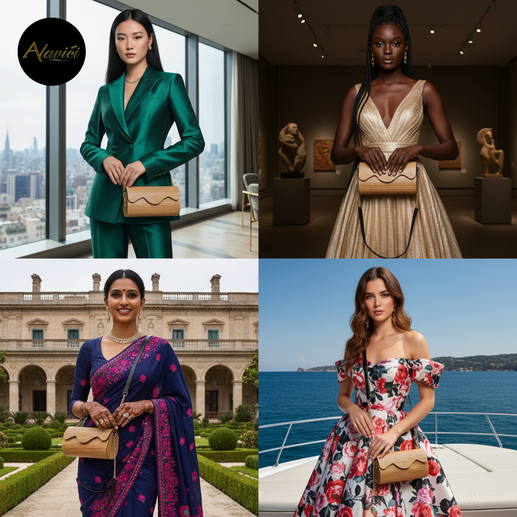 Introducing the Alavici ZS-WB008B “Tiffany” — an exquisite, slim zip-wrap clutch handcrafted from dyed wood with an opulent Tiffany-teal finish. Inside, buttery vegan leather cushions your essentials; outside, the wood’s fine grain and gold hardware make a quiet, unmistakable statement. Designed for the discerning client who prizes rarity, tactility and refined understatement.