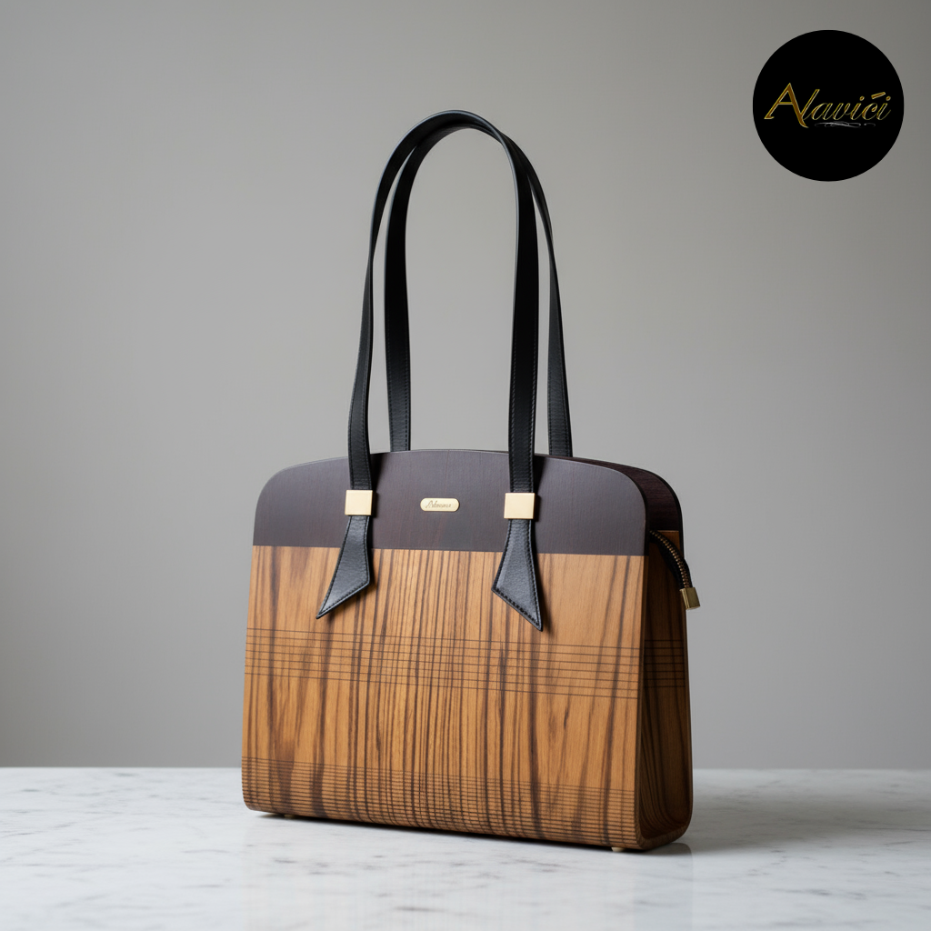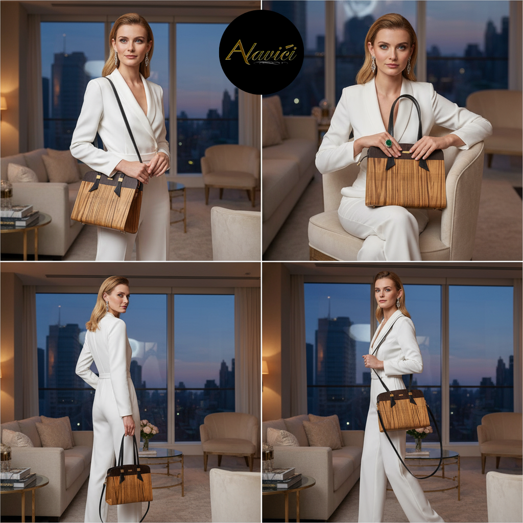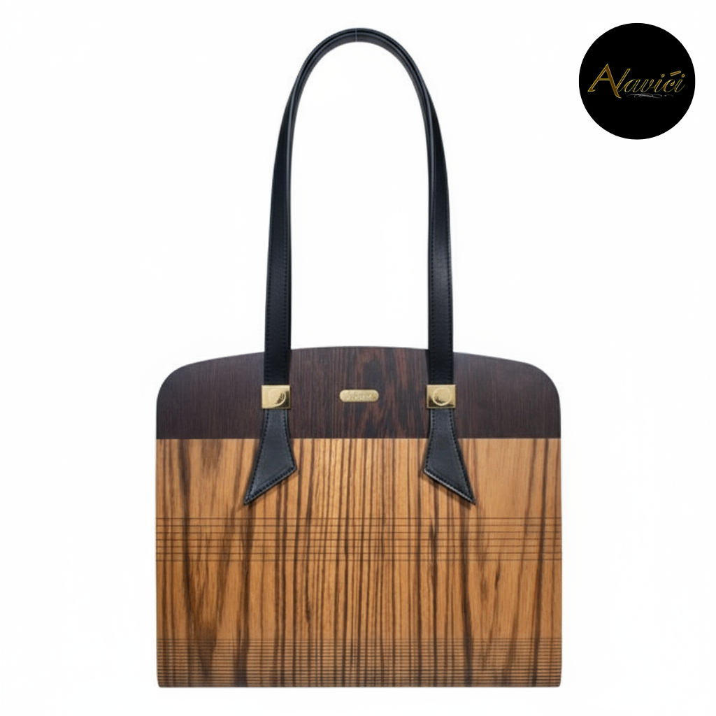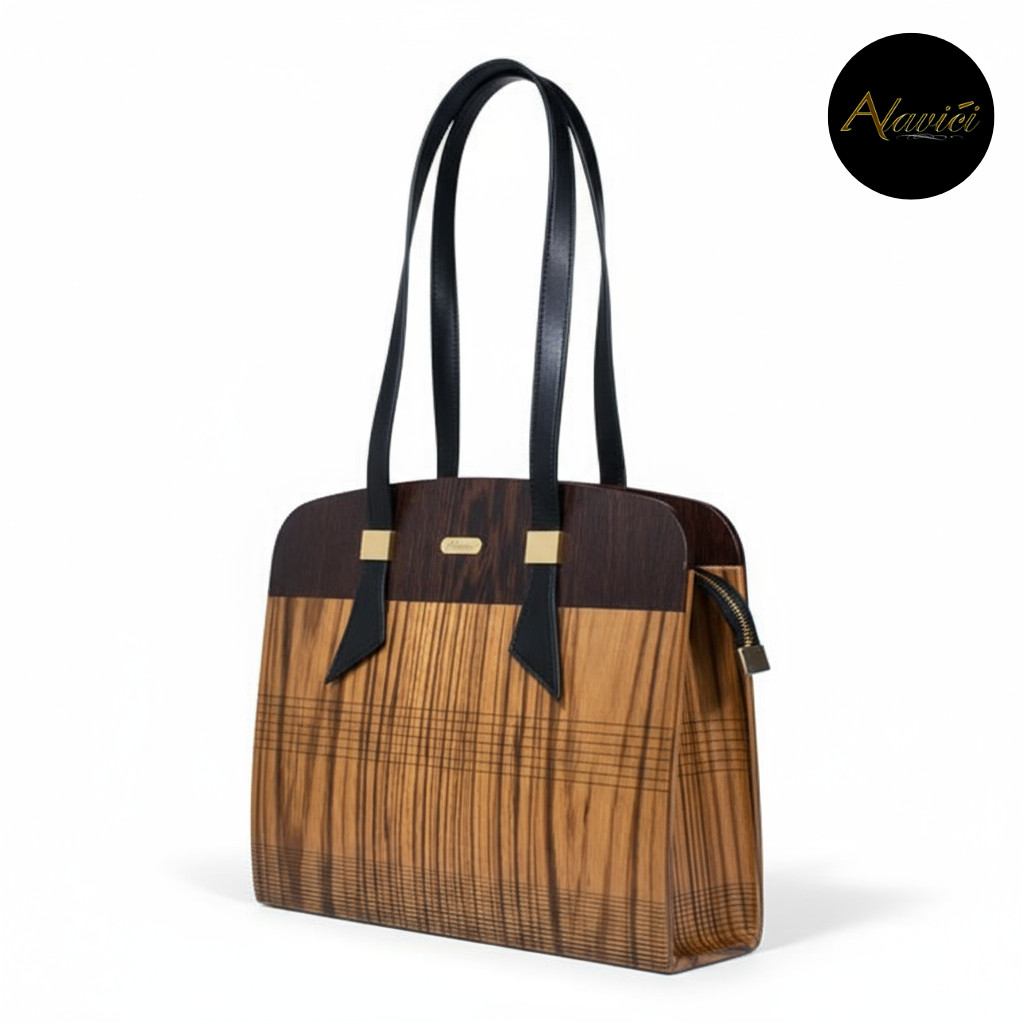 The Zebrawood & Deep Ebony Dual-Tone Tote is a masterclass in natural contrast. Featuring the bold, linear striations of exotic zebrawood paired with the commanding depth of ebony veneer, it evokes both vitality and authority. A structured profile with gold-accent hardware and long black leather straps elevates it from mere accessory to statement architecture for the hand.