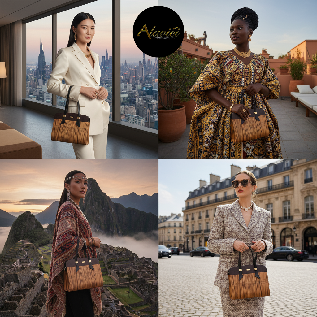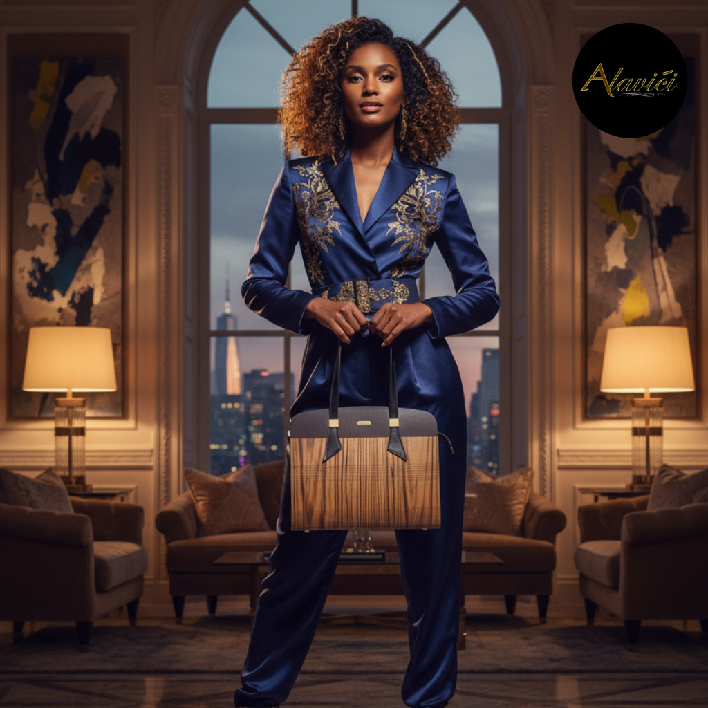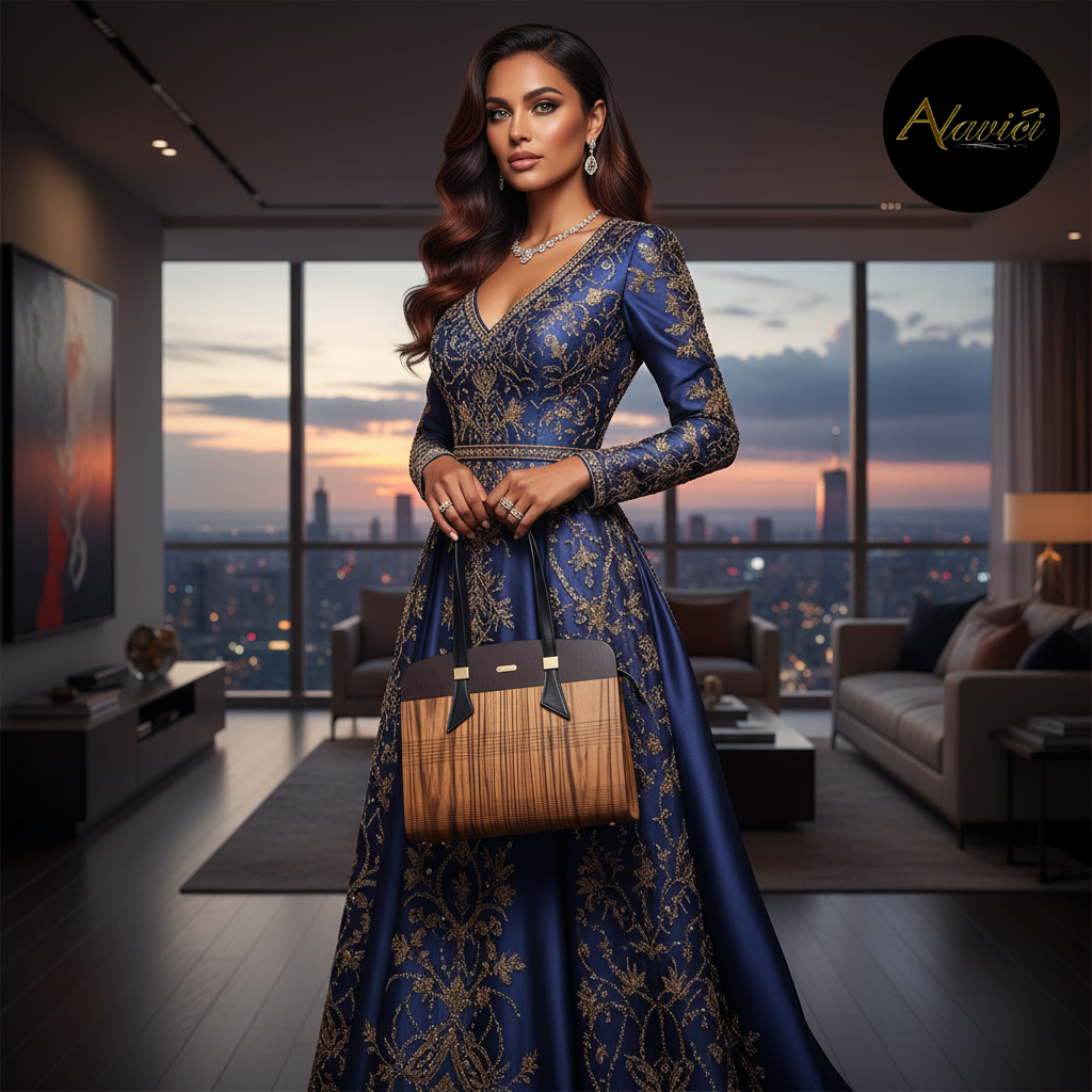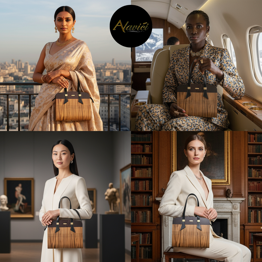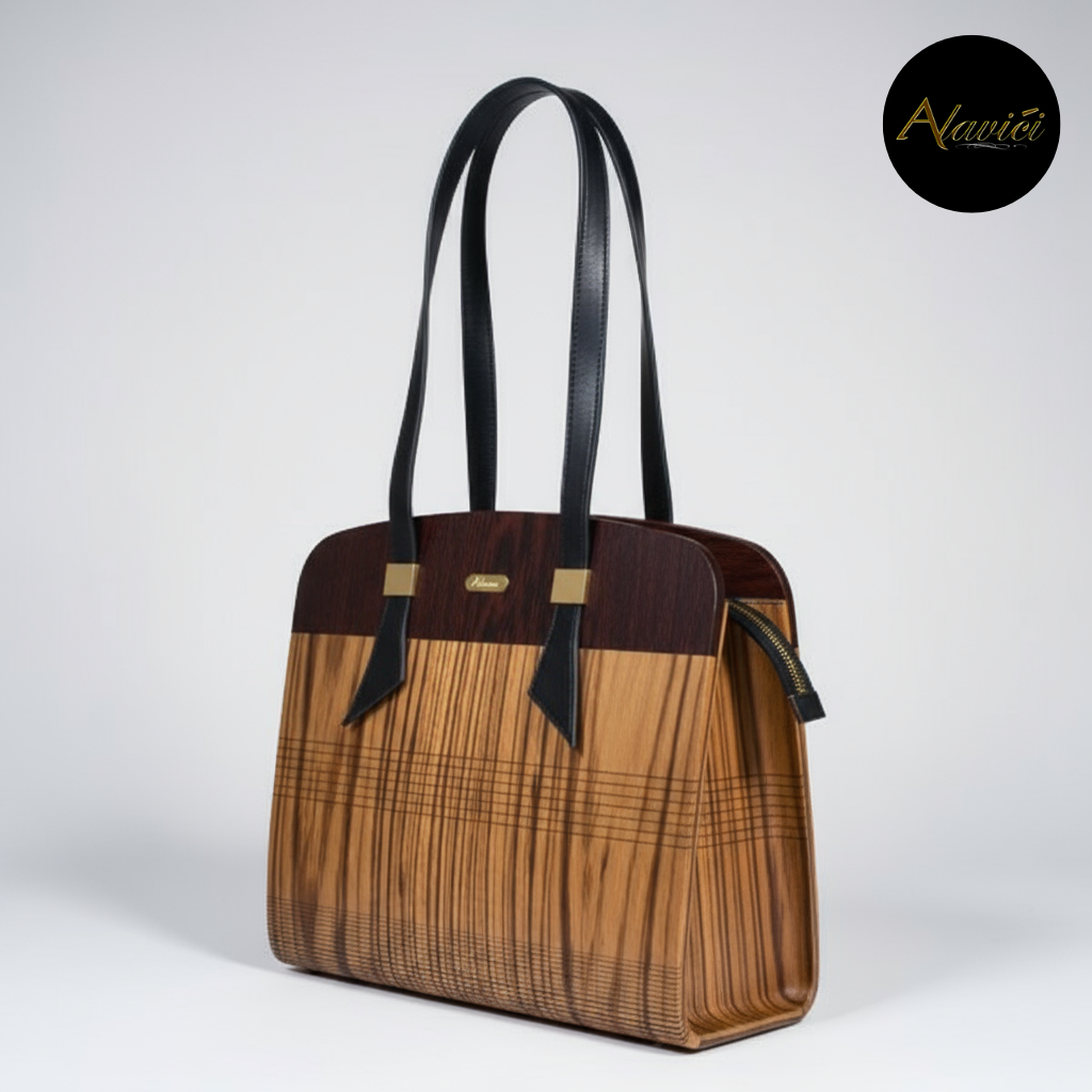 The Zebrawood & Deep Ebony Dual-Tone Tote is a masterclass in natural contrast. Featuring the bold, linear striations of exotic zebrawood paired with the commanding depth of ebony veneer, it evokes both vitality and authority. A structured profile with gold-accent hardware and long black leather straps elevates it from mere accessory to statement architecture for the hand.